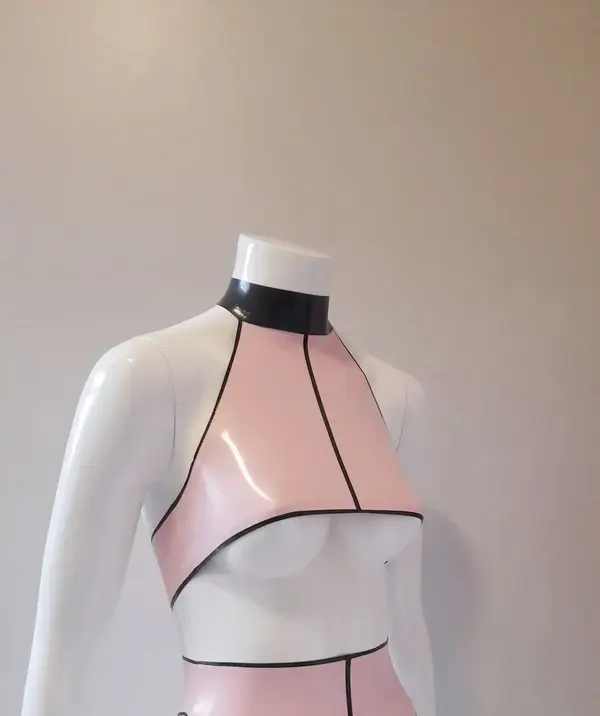 The silhouette features a daring plunging V-neckline that highlights your cleavage, anchored by a cute black latex bow at the center. It’s designed to hug your torso comfortably, offering a supportive fit without wires, making it perfect for long nights of dancing or roleplay.