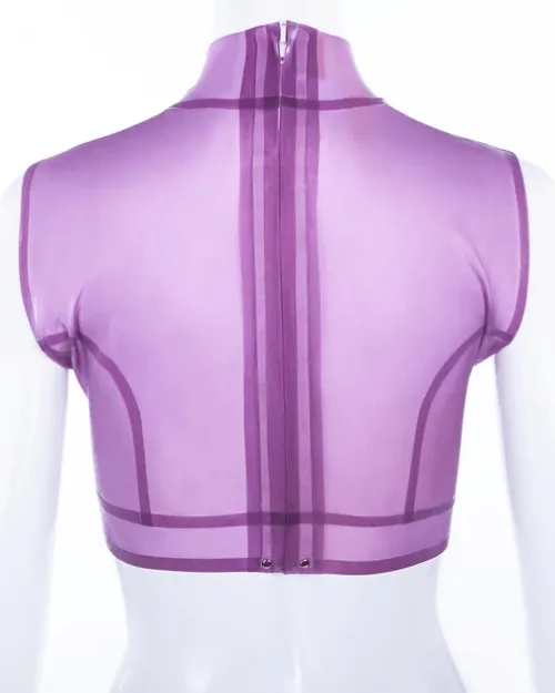 Sheer Lilac Latex Crop Top with High Neck and Back Zipper